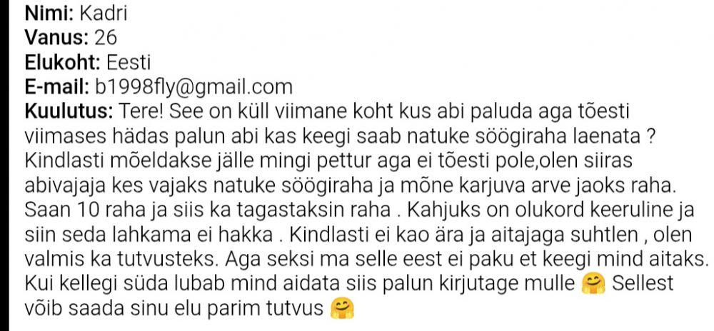 Kuulutus: Panin siia üleeile ülesse abipalve postituse(lisatud pildina) . Olen saanud ainult mõnitusi alandusi ja kiusu. Sa ei tea minu lugu et niimoodi teha . Ma tõesti olen abivajaja. Kui päriselt keegi soovib aidata,kirjuta mulle palun. Kui ülekannet ei soovi teha võid aidata maksta mõne arve 🤗esimesel võimalusel tagastan raha
